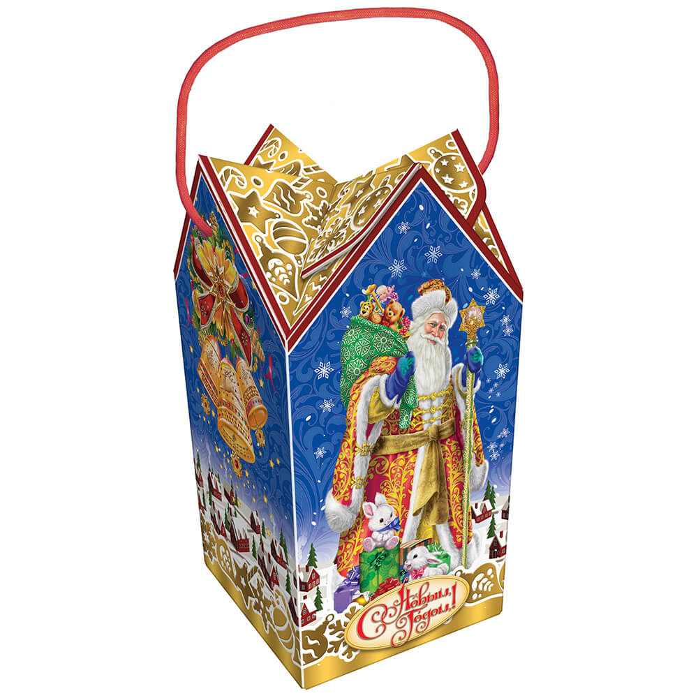 Коробка сундучок в форме домика с ручкой-шнурком. Оформлена в традиционном новогоднем стиле, с морозными узорами и праздничными украшениями, и Дедом Морозом в сказочном кафтане.
