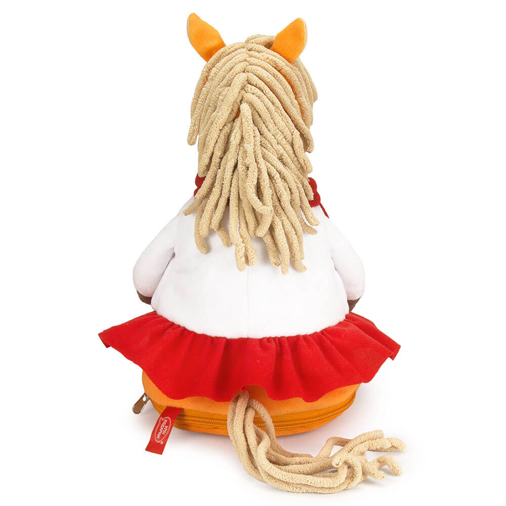 Новогодний подарок Лошадь Бьянка сшита из мягкого софта оранжевого цвета. У нее полосатая футболка с белой рубашкой, также красный шарф, который элегантно перевязан. Внутри мягкой игрушки потайной карман на молнии со сладким подарком. Набор конфет 300г Премиум.