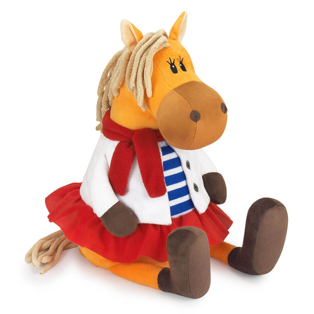 Новогодний подарок Лошадь Бьянка сшита из мягкого софта оранжевого цвета. У нее полосатая футболка с белой рубашкой, также красный шарф, который элегантно перевязан. Внутри мягкой игрушки потайной карман на молнии со сладким подарком. Набор конфет 800г Люкс.