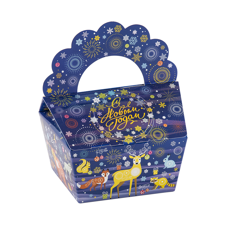 Ларец с ручкой из картона синего цвета с новогодней тематикой.