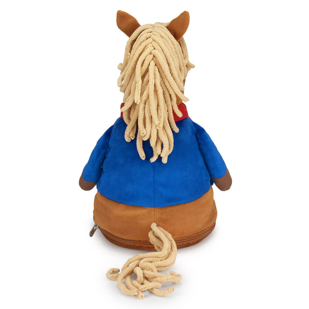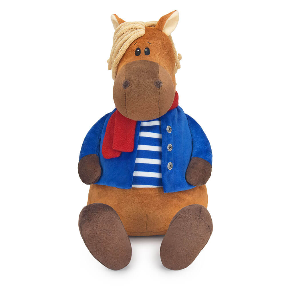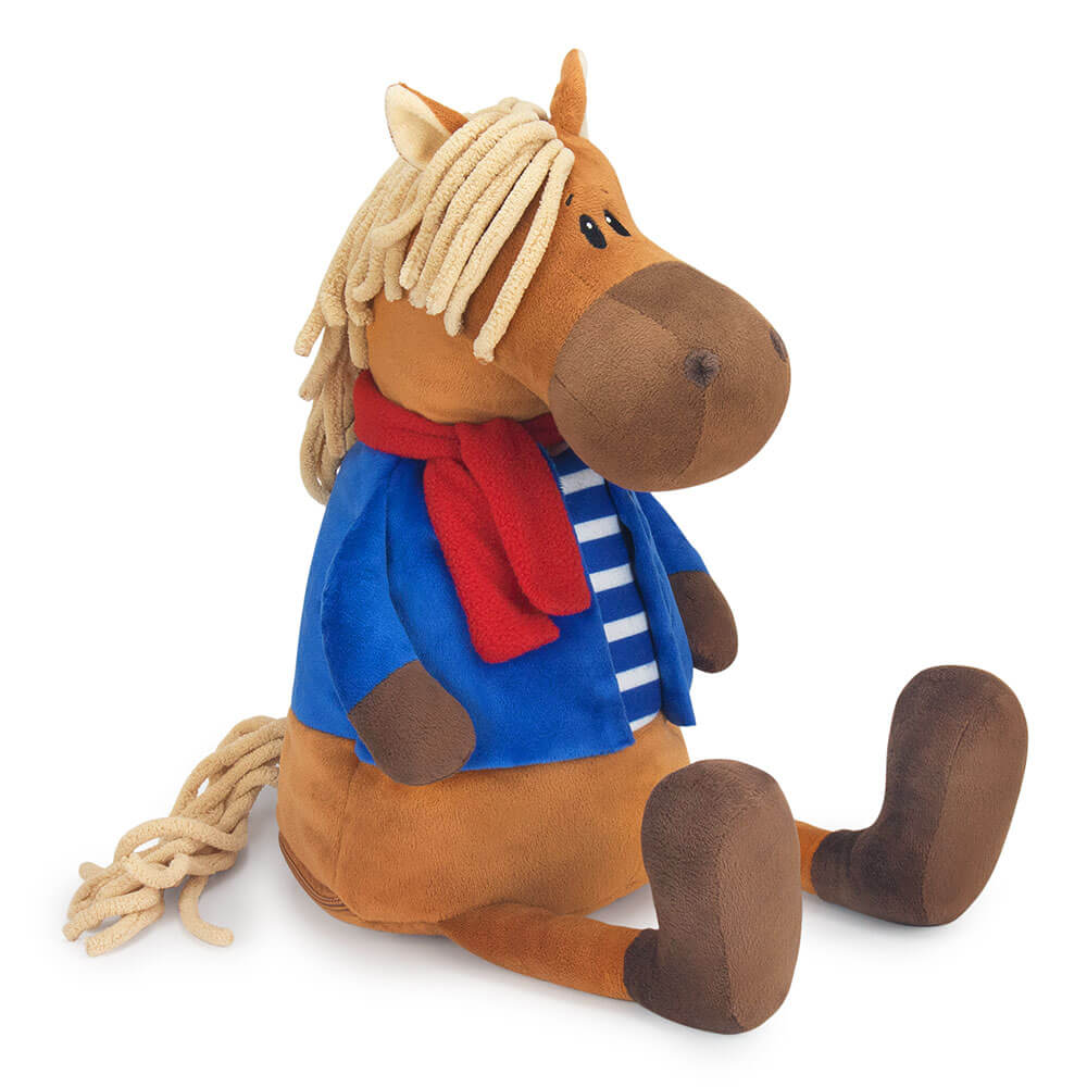 Мягкая игрушка-упаковка для конфет конь Билли сшит из мягкого софта коричневого цвета. У него полосатая футболка с синей рубашкой, также красный шарф, который элегантно перевязан. Оригинальная новогодняя текстильная упаковка для сладостей вместимостью до 1100 г.