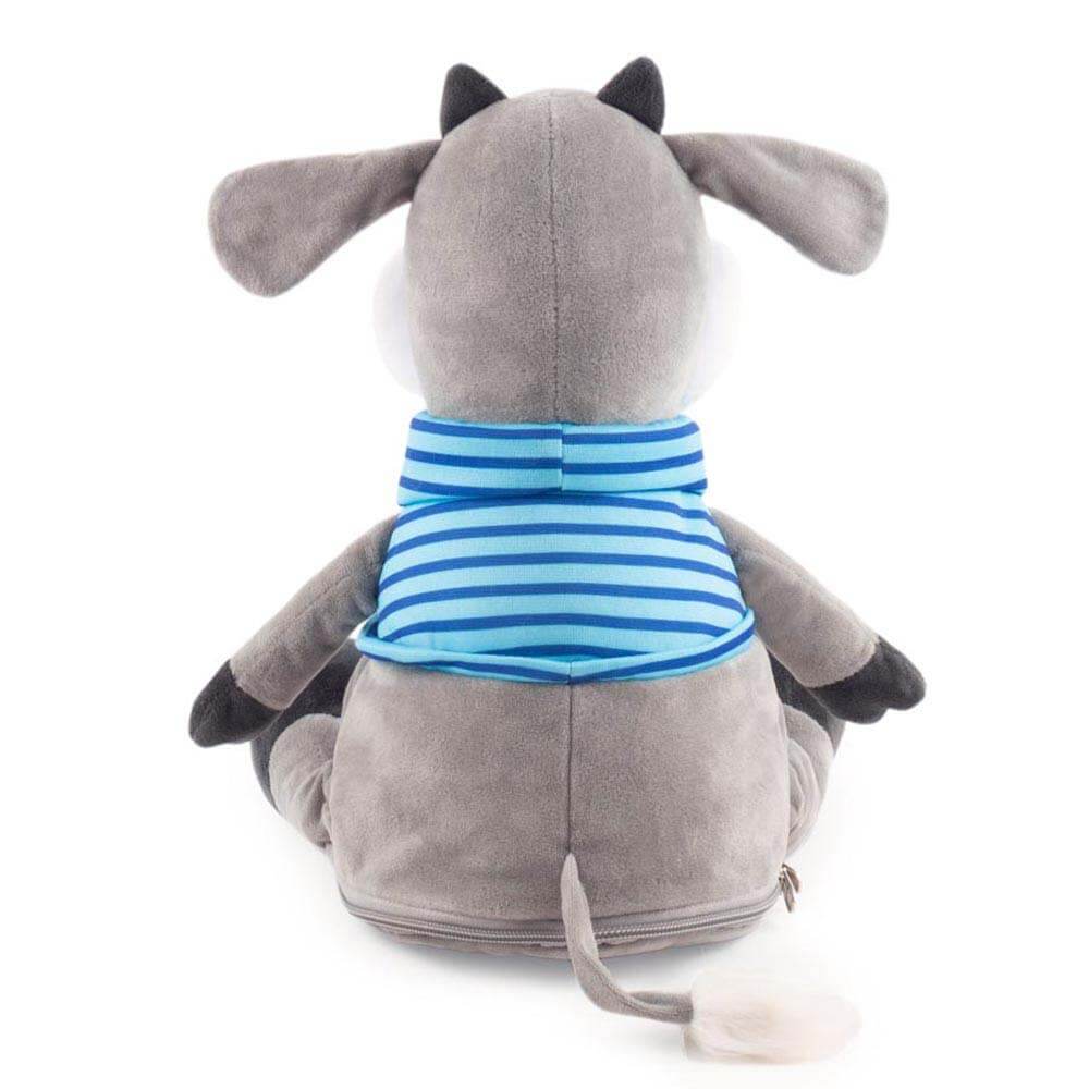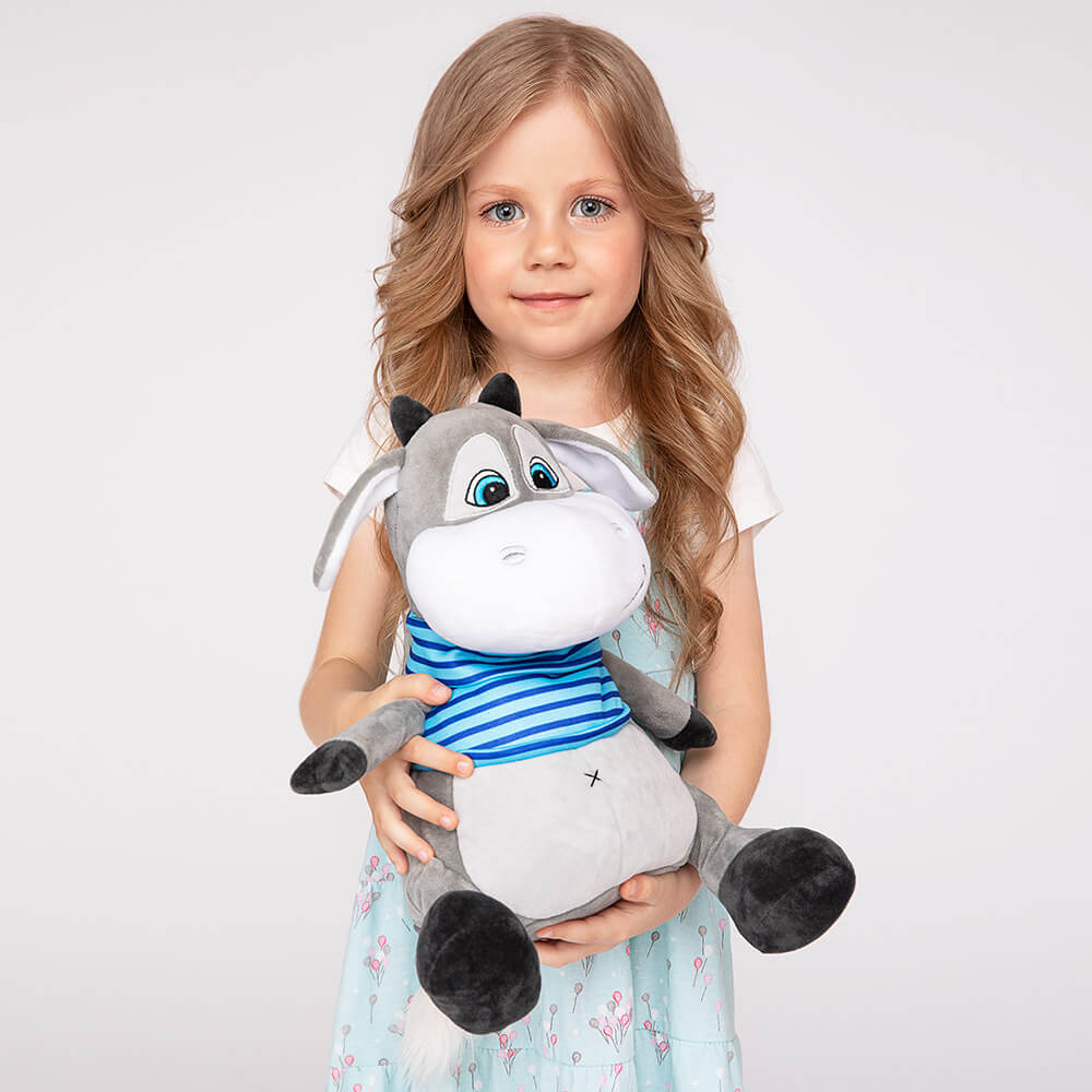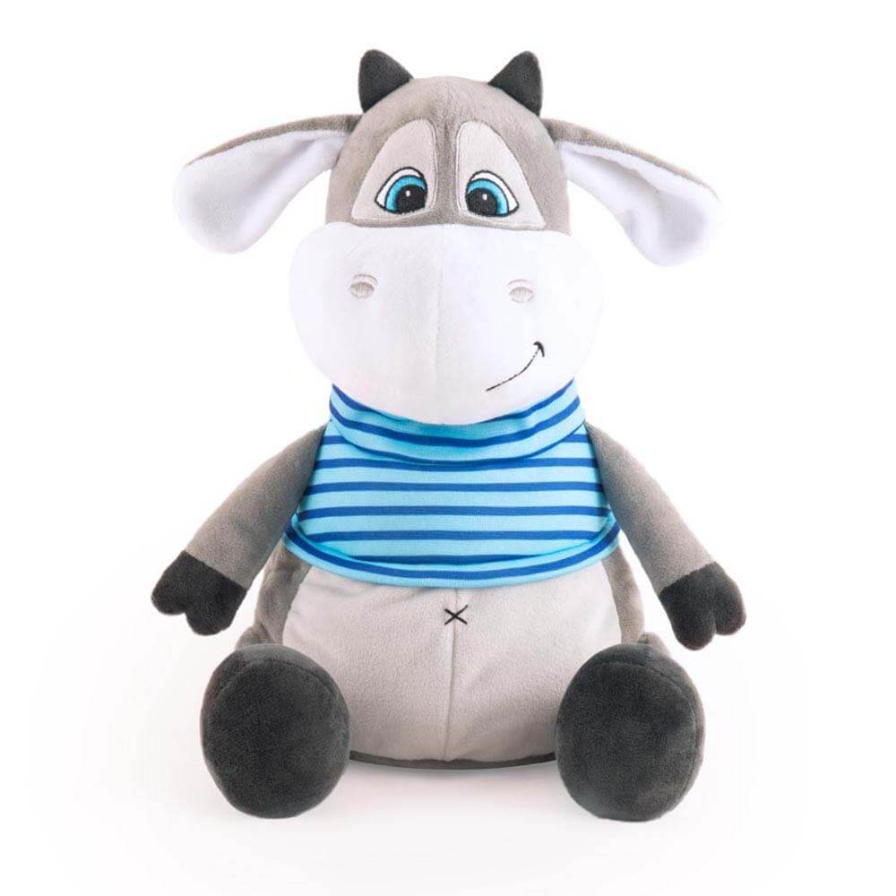 Добрый плюшевый бычок нежно‑серого цвета, в полосатой маечке придется по душе и мальчикам, и девочкам. Невероятно симпатичный бычок Вилли подарит много восторга и станет верным другом в детских играх.