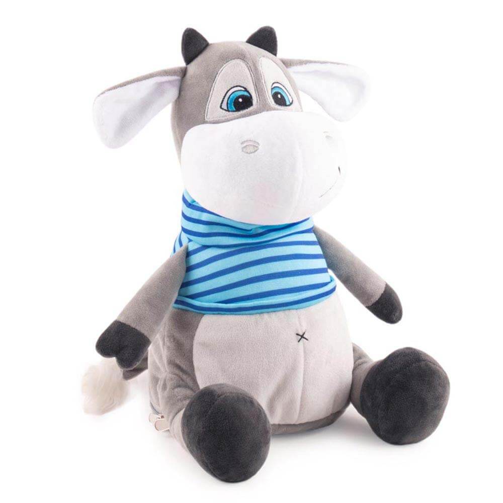 Игрушка‑бычок сшита из мягкого плюша красивых серых оттенков. Большие голубые глазки сделаны вышивкой. В нижней части мягкой игрушки есть потайное отделение на молнии.